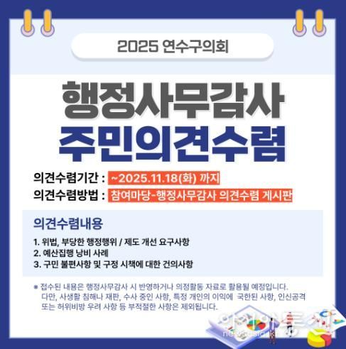 [아시아통신] 인천광역시 연수구의회는 2025년 행정사무감사를 앞두고 주민들의 의견을 11월 18일까지 받는다.