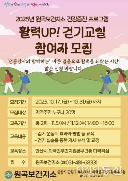 [아시아통신] 안산시 단원보건소 원곡보건지소는 오는 31일까지 ‘맞춤형 건강 프로그램 ’활력UP! 걷기교실’ 참여자를 모집한다고 16일 밝혔다.