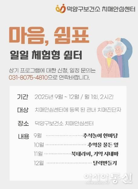 [아시아통신] 고양특례시 덕양구보건소 치매안심센터는 정규 쉼터 프로그램 참여가 어려운 관내 치매 어르신을 대상으로, 일일 체험형 쉼터 프로그램 ‘마음, 쉼표’를 12월까지 운영한다고 밝혔다.