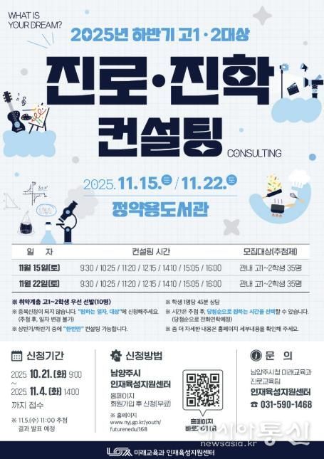 [아시아통신] 남양주시는 오는 21일부터 ‘2025년 하반기 진로·진학 컨설팅’참가자를 모집한다고 밝혔다.