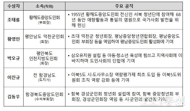 한편, 이번 대회에서는 올해 ‘국가사회발전 이북도민 유공’ 정부포상자로 선정된 39명 중 5명의 유공도민에게 국민훈장 동백장이 수여된다.