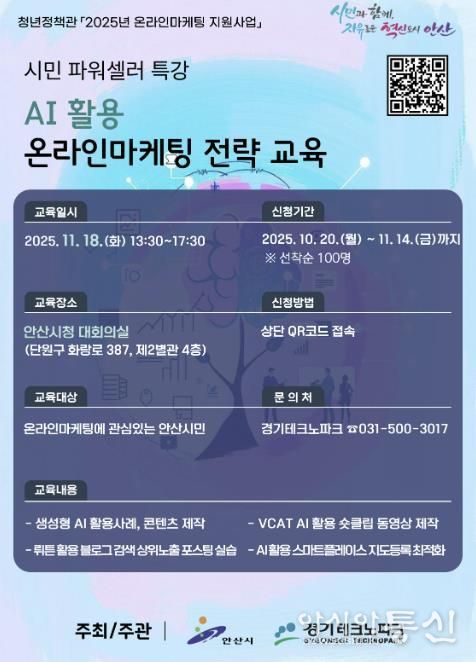 교육은 11월 18일 오후 1시 30분부터 5시 30분까지 안산시청 대회의실(제2별관 4층)에서 진행된다. 온라인 마케팅에 관심 있는 시민 누구나 무료로 참여할 수 있다.