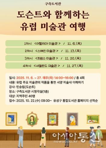 [아시아통신] 대전 유성구는 11월 6일부터 27일까지 매주 목요일 구즉도서관에서 ‘도슨트와 함께하는 유럽 미술관 여행’ 강연을 개최한다.