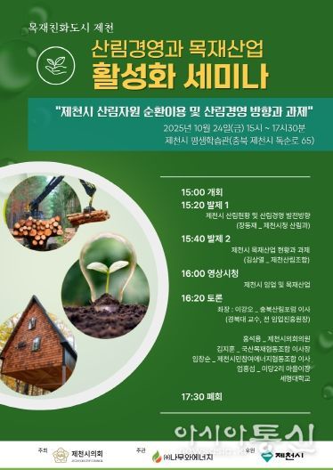 [아시아통신] 제천시의회은 오는 10월 24일, 제천시 평생학습관에서 ‘목재친화도시 제천의 산림경영과 목재산업 활성화 세미나’를 개최한다.