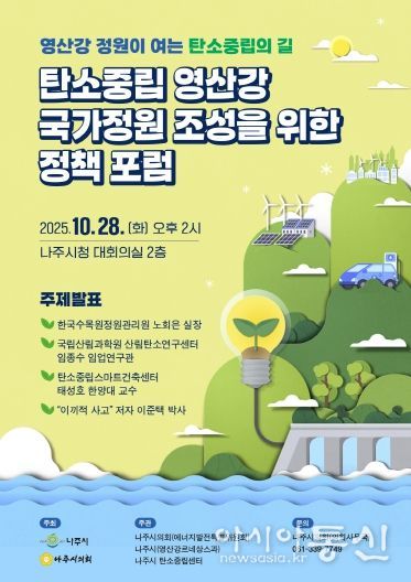 [아시아통신] 나주시의회는 나주시와 오는 28일 오후 2시, 나주시청 대회의실에서 '탄소중립 영산강 국가정원 조성을 위한 정책포럼'을 공동 개최한다고 21일 밝혔다. 이번 포럼은 탄소중립 실현을 위한 다양한 전략을 모색하고, 향후 영산강 국가정원 지정의 구체적 방향을 논의하기 위해 마련됐다.