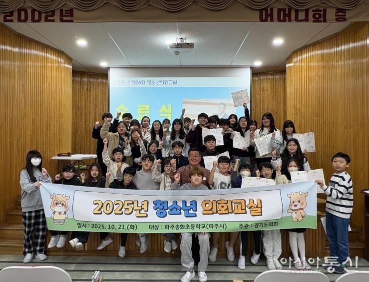 [아시아통신] 경기도의회 건설교통위원회 안명규 의원(국민의힘, 파주5)은 10월 21일 파주송화초등학교 시청각실에서 열린 ‘제36회 청소년의회교실’에 참석해 파주 송화초등학교 학생들과 함께 모의의회를 체험하며 민주주의의 가치와 의회의 역할을 함께 나누는 뜻깊은 시간을 가졌다.