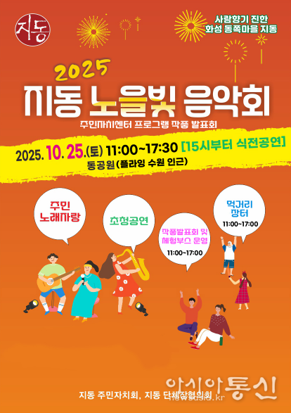 오는 10월 25일, 수원시 팔달구 지동 동공원(지동 267-12)에서 활력 넘치는 가을날을 아름다운 음악과 주민들의 열정으로 채울 특별한 축제, ‘2025 지동 노을빛 음악회·주민자치센터 작품발표회’가 열린다.