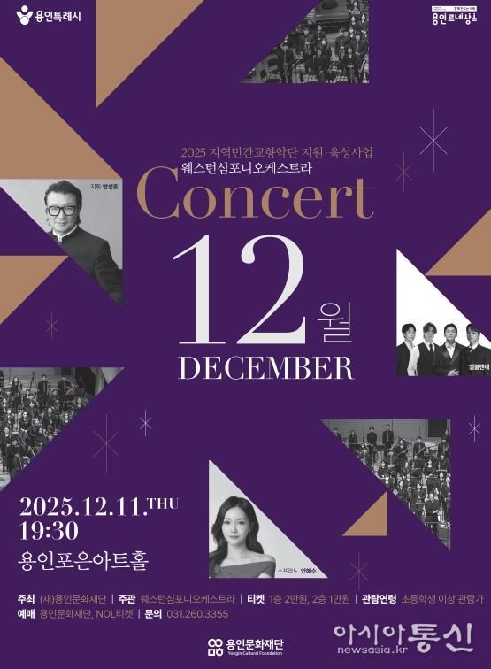 [아시아통신] 용인문화재단은 오는 12월 11일 오후 7시 30분, 용인포은아트홀에서 웨스턴심포니오케스트라 '콘서트 ‘12월’' 공연을 개최한다.