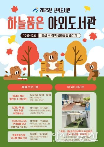 11월에는 도서관 사서가 특정한 주제에 맞는 책을 선별해 야외공간에 전시하는 ‘언제나 책봄, 사서 추천 북큐레이션’과 여행작가와 프로그램 수강생들의 사진 전시를 비롯해 여행 특화 프로그램 ‘여행스케치’의 여행 드로잉 작품과 여행작가 사인․여행 도서 북큐레이션 등을 전시하는 ‘신BOOK 도서관, 무거동을 담다’를 운영한다.