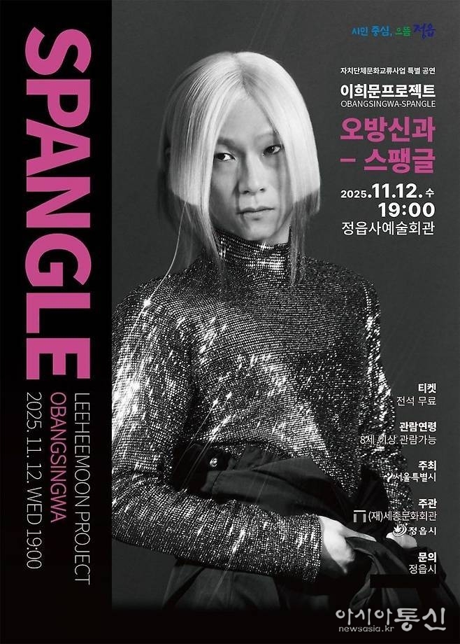 이희문 프로젝트 '오방신과 - 스팽글' 공연 포스터. 정읍시 제공 4일 시에 따르면 국가무형문화재 제57호 경기민요 이수자인 이희문은 '조선의 아이돌', 'B급 소리꾼'으로도 불리며 민요를 팝, 댄스, 록, 블루스 등 다양한 장르와 결합해 'K-전통 팝'이라는 독자적인 음악 세계를 구축한 아티스트다.