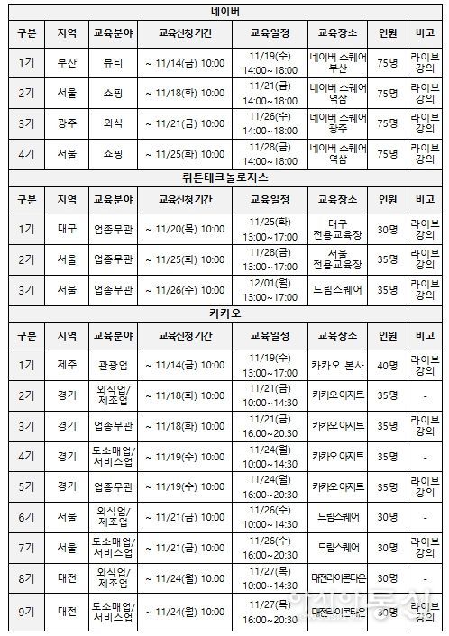 국내의 대표적인 인공지능(AI) 기업인 네이버, 뤼튼테크놀로지스, 카카오(이상 가나다 순)가 교육기관으로 참여하며, 각 기관이 직접 기획한 교육과정(커리큘럼)에 따라 현장 교육과 온라인 교육이 함께 진행될 예정이다.