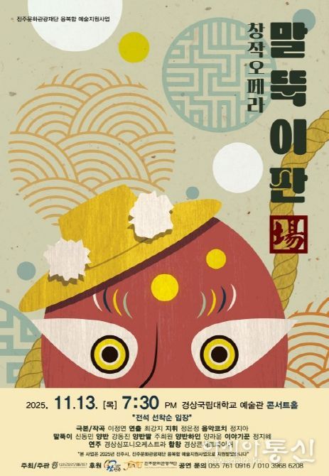 [아시아통신] 경상국립대학교 음악교육과 최강지 교수가 이끄는 경상오페라단은 진주의 대표 민속예술 ‘진주 오광대’를 모티브로 한 창작오페라 '말뚝이판場'(작사·작곡 이정연)을 11월 13일 오후 7시 30분 경상국립대학교 음악교육과 콘서트홀에서 초연한다.
