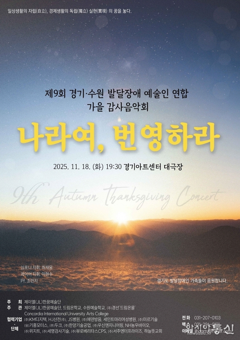 “나라여, 번영하라”, 우리나라의 안정과 번영을 기원하는 뜻으로 2025년 11월 18일(화) 19시 30분, 경기아트센터 대극장에서 경기.수원 발달장애 예술인들이 연합으로 제9회 가을 감사음악회를 개최한다.