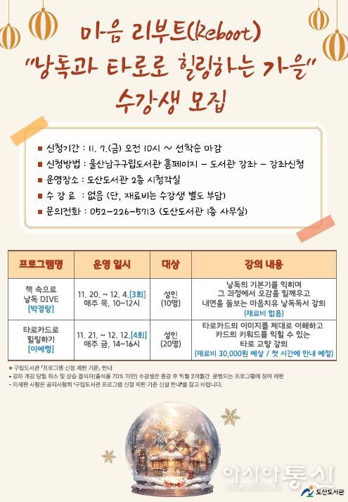 [아시아통신] 울산 남구 도산도서관은 지역 주민들에게 인문학적 소양 함양의 기회를 제공하고 보다 다채로운 독서문화 환경을 조성하기 위해 『마음 리부트(Reboot): “낭독과 타로로 힐링하는 가을”』을 운영한다고 밝혔다.
