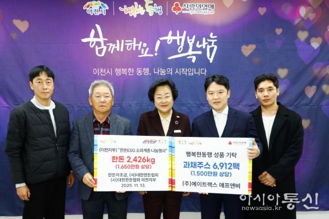 [아시아통신] 이천시는 11월 13일 시청에서 지역 사회를 위한 따뜻한 나눔이 이어졌다고 밝혔다. 이날 기탁식에는 (사)대한한돈협회 이천지부와 ㈜에이트랙스 애프앤비가 참여해 이웃사랑 실천에 동참했다.