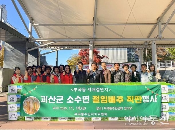 [아시아통신] 의왕시 부곡동주민자치위원회가 11월 14일 부곡동주민센터에서 자매결연지 괴산 소수면의 대표 농산물 중 하나인 괴산절임배추 직거래 행사를 개최했다.