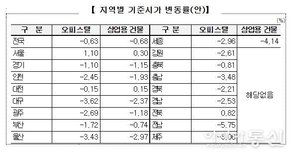 기준시가(안)에 따르면, 오피스텔은 전년 대비 0.6 % 하락, 상업용 건물은 전년 대비 0.7 % 하락한 것으로 확인된다. 다만, 서울 지역의 오피스텔과 상업용 건물 기준시가는 공히 각각 1.1 %, 0.3 % 상승한 것으로 나타난다.