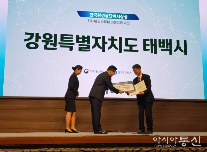 [아시아통신] 태백시는 지난 17일 소노캄여수에서 열린 ‘2025 지자체 탄소중립 컨퍼런스’에서 탄소중립 이행성과 부문 우수기관으로 선정돼 한국환경공단 이사장상을 수상했다고 밝혔다.
