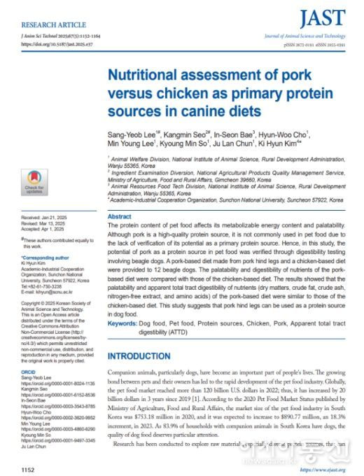 연구진은 비글견 12마리에게 닭고기 기반 사료와 돼지고기 뒷다리살을 단백질원으로 제조한 시험 사료를 각각 15일간 급여한 후, 소화율과 기호성을 비교 평가했다.