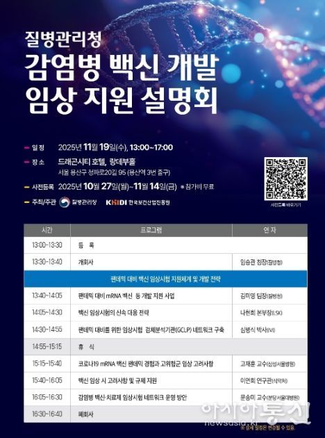 [아시아통신] 질병관리청 국립보건연구원(원장 직무대리 김원호)은 mRNA 등 백신 개발을 위한 협력과 지원 방안을 공유하기 위한 '백신 개발 임상 지원 설명회'를 개최한다.