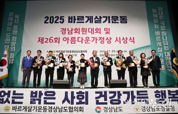 [아시아통신] 경상남도가 20일 창원컨벤션센터에서 열린 ‘2025 바르게살기운동 경남 회원대회 및 제26회 아름다운 가정상 시상식’에서 지역사회 봉사에 앞장서 온 회원들을 격려했다.