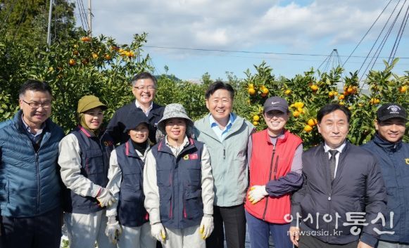 [아시아통신] 오영훈 제주특별자치도지사가 20일 오후 서귀포시 남원읍 위미리 온주밀감 수확 농장을 찾아 일손 돕기에 나섰다.