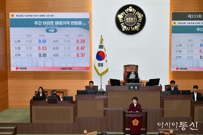 서울특별시의회 보건복지위원회 신동원 의원(노원1, 국민의힘)은 11월 20일(목) 열린 제333회 정례회 제3차 본회의 5분 발언에서 이재명 정부가 발표한 ‘10·15 부동산 대책’과 그로 인한 서울시 토지거래허가구역(토허제) 지정은 서울 지역 부동산시장의 불균형을 심화시키고 있다며 노원구를 비롯한 강북 외곽 지역의 규제를 완화할 것을 국토교통부와 서울시에 촉구했다.