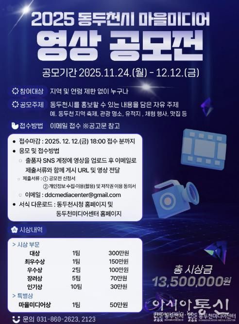 [아시아통신] 동두천시는 지역 곳곳의 숨은 매력을 발굴하고 시민 참여형 홍보콘텐츠를 확대하기 위해 ‘2025년 동두천시 마을미디어 영상 공모전’을 개최한다.