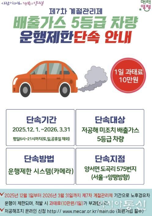 [아시아통신] 양평군(은 오는 12월 1일부터 2026년 3월 31일까지 제7차 미세먼지 계절 관리제 시행에 따라 배출가스 5등급 차량에 대한 운행 제한 단속을 시행한다고 밝혔다.