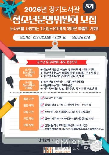 [아시아통신] 김포시 장기도서관은 2026년 제8기 청소년운영위원회 위원으로 활동할 김포시 거주 13세~18세 청소년 20명을 오는 12월 1일부터 모집한다.