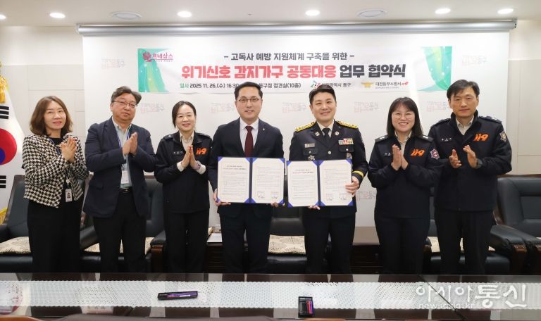 [아시아통신] 대전 동구는 26일 구청장 접견실에서 대전 동부소방서(서장 이준서)와 ‘위기신호 감지가구 공동대응’ 업무협약을 체결했다고 밝혔다.