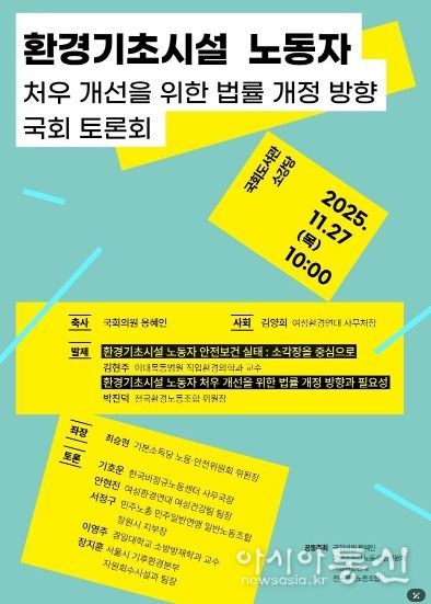 [아시아통신] 기본소득당 국회의원 용혜인과 기본소득당 노동·안전위원회, 전국환경노동조합, 여성환경연대는 11월 27일 목요일 오전 10시, 국회도서관 소강당에서 '환경기초시설 노동자 처우 개선을 위한 법률 개정 방향 국회 토론회'를 공동 개최한다.