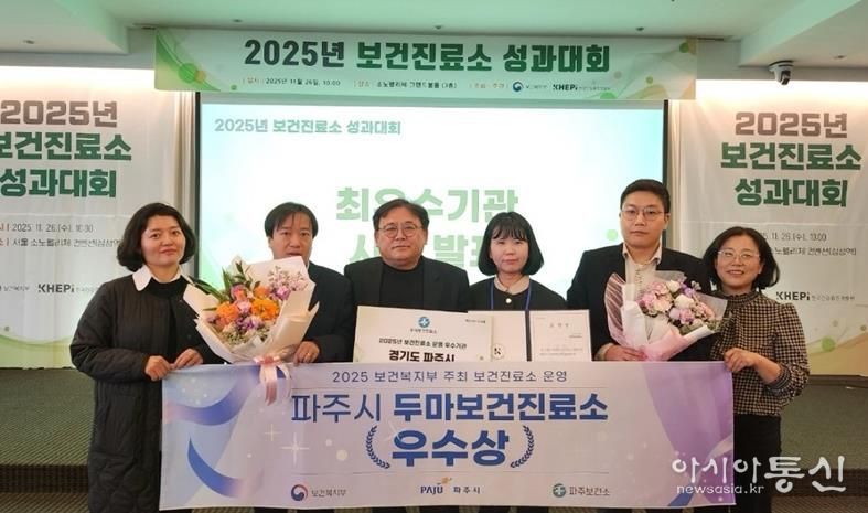 [아시아통신] 파주시는 지난 26일 보건복지부가 주최한 녩년 보건진료소 운영 성과대회’에서 두마보건진료소가 건강 증진 사업 분야 우수기관으로 선정됐다고 밝혔다. 이는 작년 어유지보건진료소의 수상에 이어 2년 연속 우수상이라는 값진 성과이다.