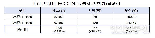 경찰청에서는 지속적인 음주운전 특별단속 및 집중 홍보, 음주 측정방해 행위(일명 술타기) 처벌 등의 영향으로 2025년 10월 31일 기준 음주 사고(-11.0%, 9,106건→8,107건) 및 사망자(-36.7%, 120명→76명)가 큰 폭으로 감소하고 있다.