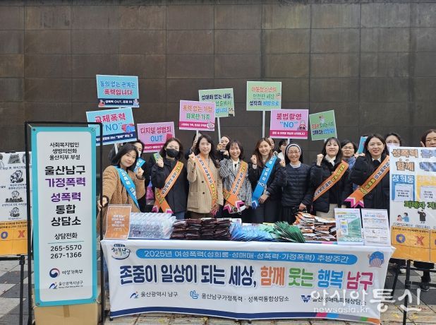 [아시아통신] 울산 남구는 ‘2025년 여성폭력 추방주간’을 맞아 27일 삼산 디자인거리 일대에서 울산성매매피해상담소와 울산남구가정폭력·성폭력통합상담소가 함께 ‘2025년 여성폭력 추방주간 캠페인’을 실시했다.