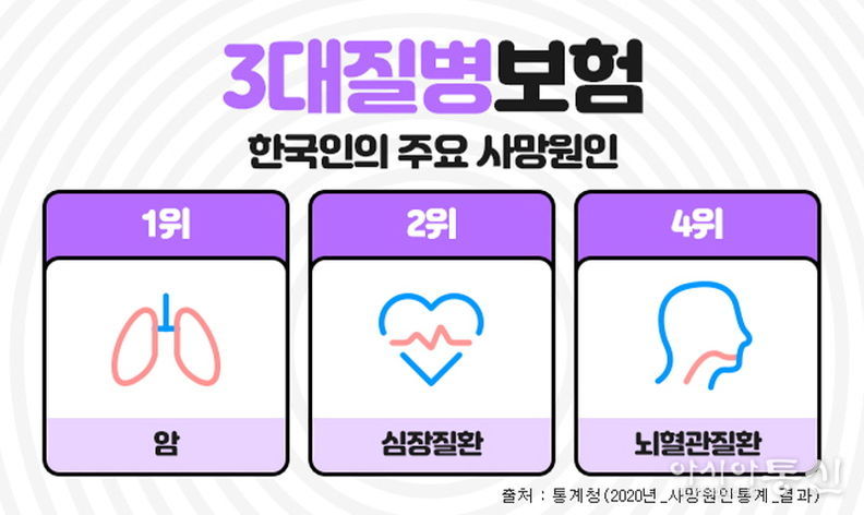 [아시아통신] 한국인의 주요 사망원인중에 암, 뇌혈관질환, 심혈관질환은 흔히 3대질병이라 일컬어지며 살아가면서 가장 먼저 대비해야 하는 중대질병으로 항상 강조되고 있다. 이들 질병에 미리 대비하기 위해 가입하는 것이 진단비보험인데, 이러한 3대질병진단비를 중점으로 보장하는 보장성보험이 3대진단비보험 이다. 3대질병진단비보험은 각각의 질병에 주목해서 보장하기도 하지만, 나에게 맞는 추가 특약을 잘 골라서 가입한다면 종합건강보험으로도 충분히 활용도가 높다.