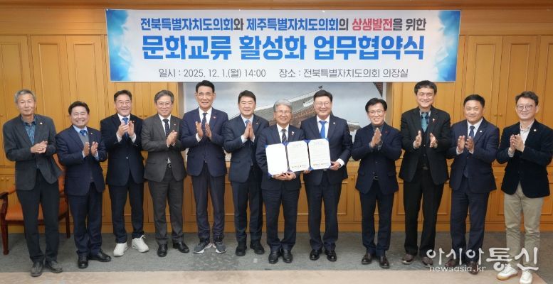 [아시아통신] 전북특별자치도의회와 제주특별자치도의회는 문화·관광·세계유산 분야 협력을 강화하기 위해 1일 전북도의회 의장실에서 문화교류 활성화 업무협약(MOU)을 체결했다.