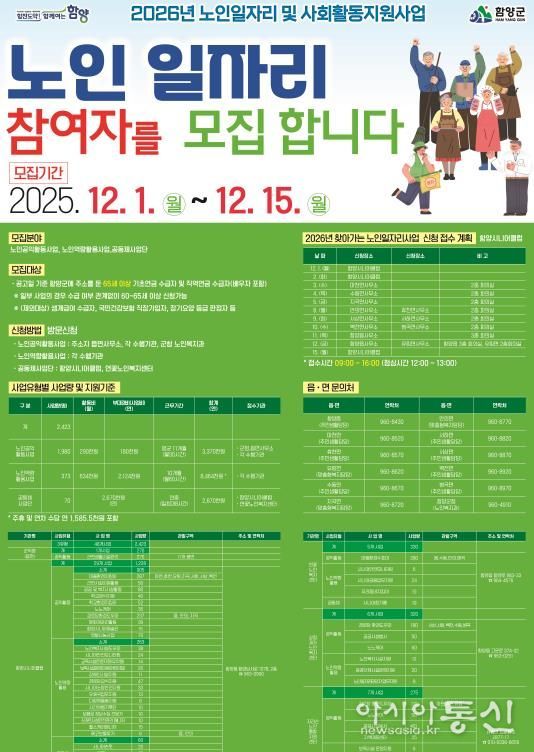 [아시아통신] 함양군은 어르신들의 안정적인 소득 보전과 사회참여활동을 확대하기 위해 12월 1일부터 15일까지 ‘2026년 노인일자리 및 사회활동지원사업’ 참여자를 모집한다.