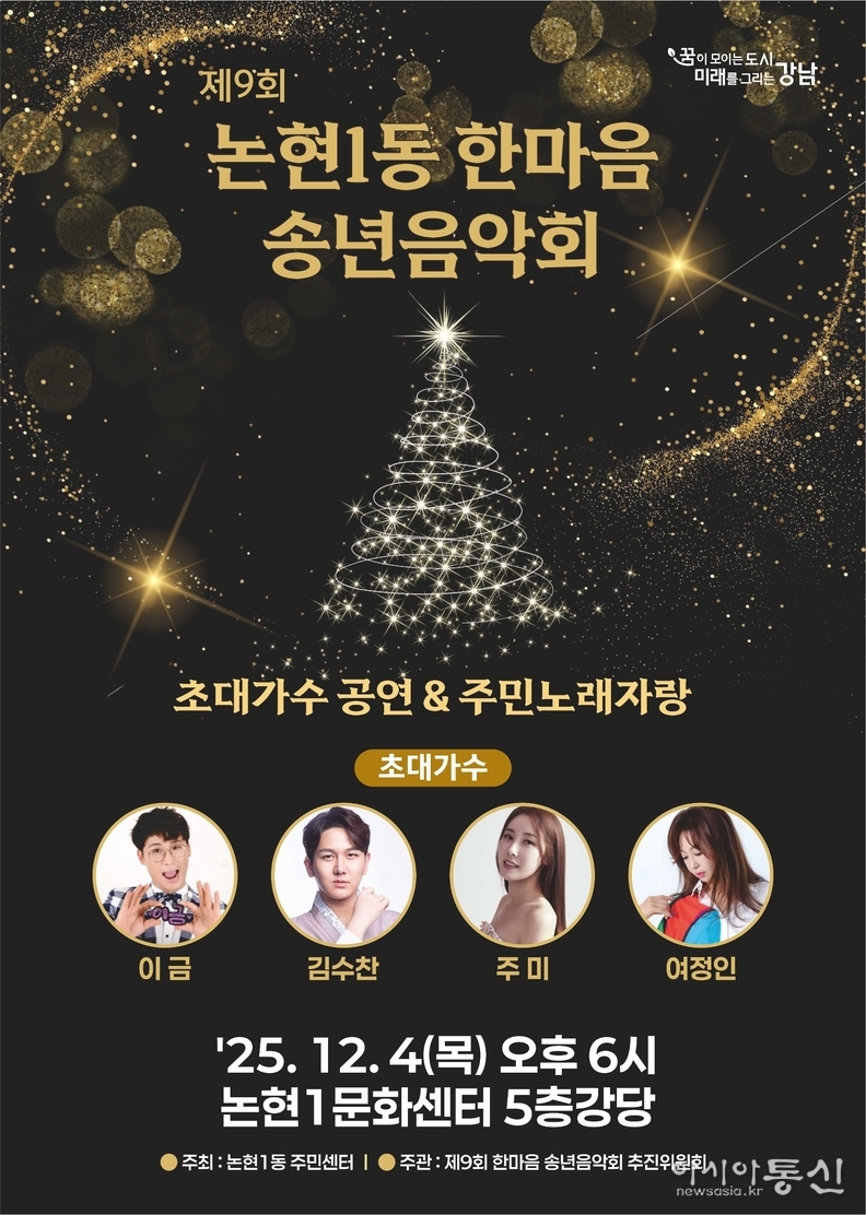 꿈이 모이는 도시, 미래를 그리는 강남구(구청장 조성명) 논현1동이 오는 4일 오후 6시 논현1문화센터 5층 강당에서 ‘제9회 한마음 송년 음악회’를 연다.
