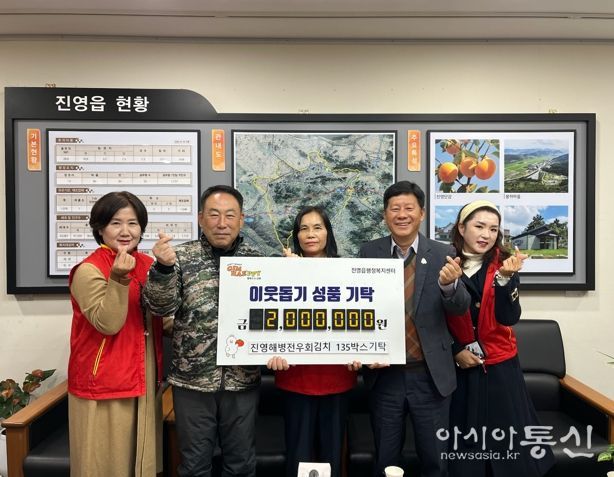 [아시아통신] 김해시 진영읍행정복지센터(읍장 이정호)는 5일 진영해병전우회(김재범 회장)에서 200만원 상당 김장김치 135박스를 기탁했다고 밝혔다.