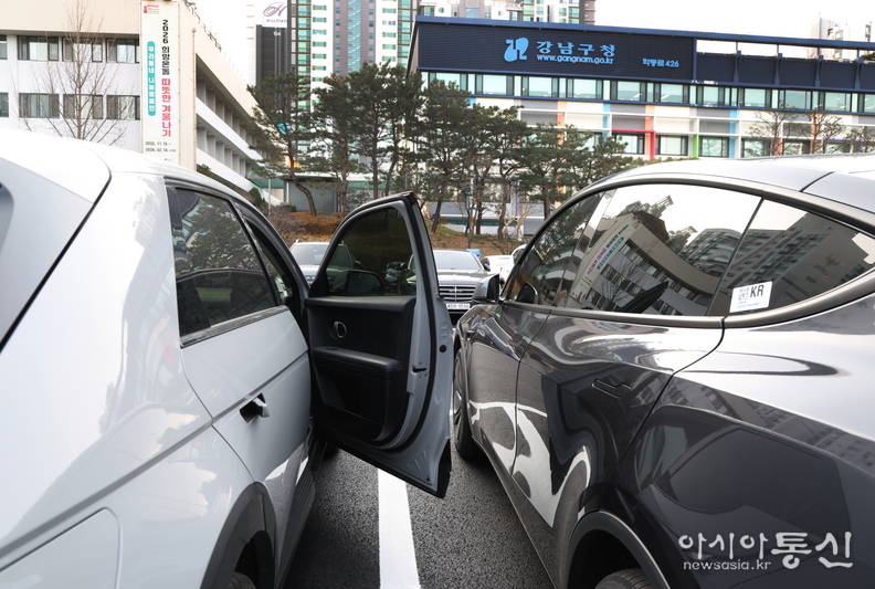 현행 「주차장법 시행규칙」 제3조, 이른바 ‘문콕방지법’은 2019년 3월 이후 신설 주차장부터 적용된다. 2001년부터 사용 중인 강남구 청사는 해당 규정을 적용받지 않지만, 구는 민원인 편의를 우선시해 자발적으로 기준을 상향 적용했다.