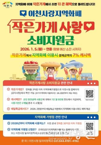 [아시아통신] 이천시는 2026년부터 이천사랑지역화폐 가맹점 연매출 기준을 기존 12억 원 이하에서 30억 원 이하로 확대하고, 연매출 3억 원 이하 소상공인을 대상으로 한 ‘작은가게사랑 소비지원금’ 사업을 본격 추진한다고 밝혔다.