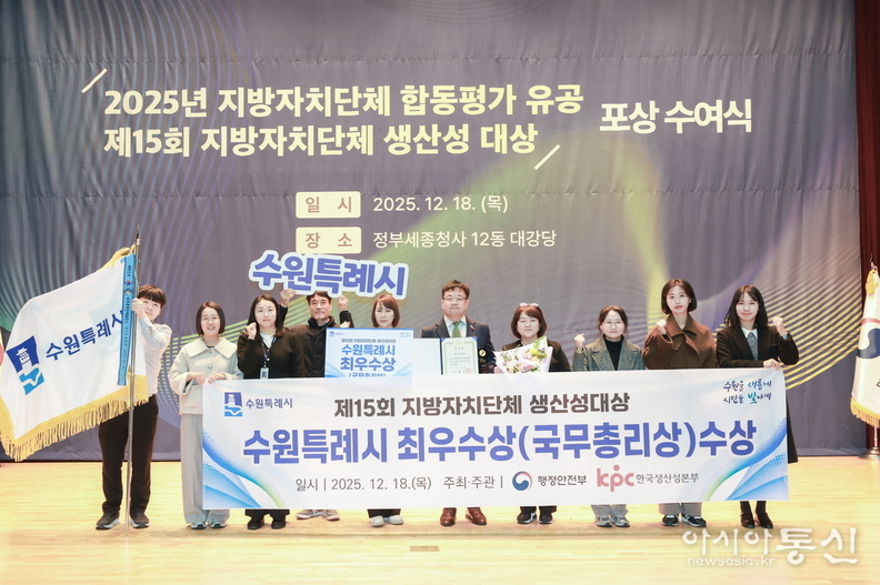 수원특례시(시장 이재준)가 행정안전부가 주최하는 ‘제15회 지방자치단체 생산성 대상’에서 최우수상(국무총리 표창)을 받았다. 시상식은 18일 정부세종청사 12동 대강당에서 열렸다.