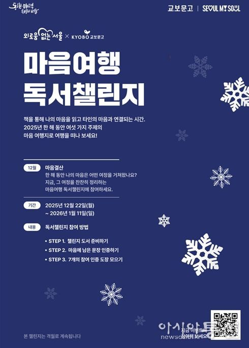 [아시아통신] 서울시가 ‘외로움 없는 서울’을 만들기 위한 노력의 일환으로 교보문고와 함께 여섯 번째 ‘마음여행 독서챌린지’를 진행한다. 이번 챌린지는 ‘마음결산’을 주제로, 올해 나의 마음을 움직인 책과 그 속에서 기억에 남는 문장을 선택해 ‘2025 마음결산 리포트’를 완성하며 한 해의 여정을 마무리한다.