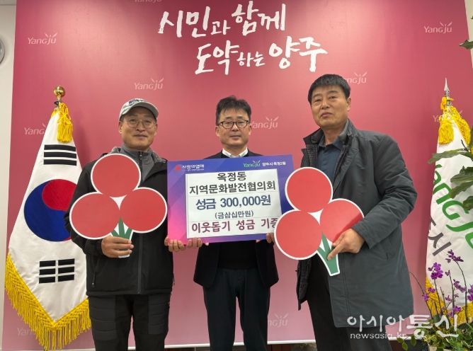 [아시아통신] 옥정동 지역문화발전협의회가 12월 22일 옥정2동 행정복지센터에서 지역 내 어려운 이웃을 돕기 위한 성금 30만 원 기부식을 하며 나눔과 상생의 가치를 실천했다.