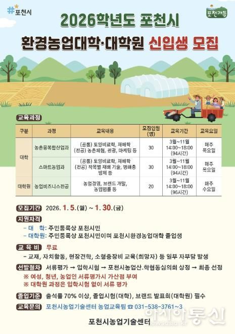 [아시아통신] 포천시는 2026년 1월 5일부터 30일까지 ‘2026학년도 포천시 환경농업대학 및 대학원’ 신입생을 모집한다.