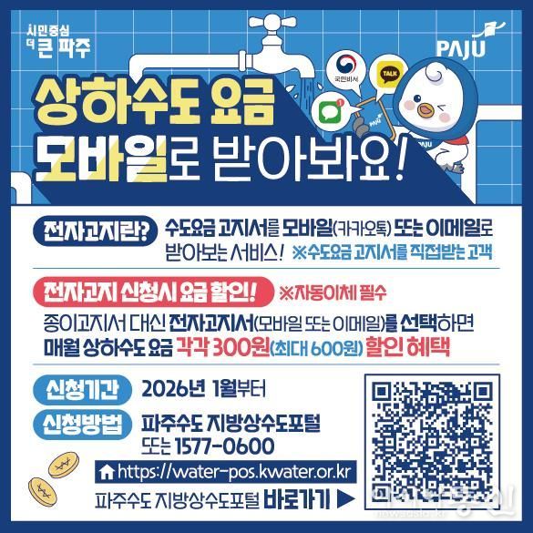 [아시아통신] 파주시는 2026년 1월부터 수도요금 전자고지와 자동납부를 동시에 신청하는 시민에게 수도요금을 할인하는 제도를 시행한다고 밝혔다.