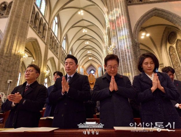 [아시아통신] 이재명 대통령과 김혜경 여사가 25일 서울 중구 명동대성당에서 열린 성탄 대축일 미사에서 기도를 하고 있다.
