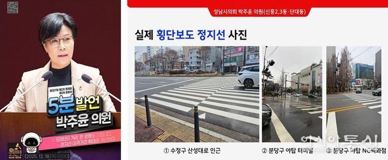 [아시아통신] 성남시의회 박주윤 의원(국민의힘, 신흥2·3동·단대동)은 12월 18일 열린 제307회 성남시의회 제3차 본회의 5분 발언에서 보행자의 생명과 직결된 ‘횡단보도 정지선 이격거리 확대 설치’의 시급성을 강조하며, 성남시의 적극적인 개선책 마련을 촉구했다.