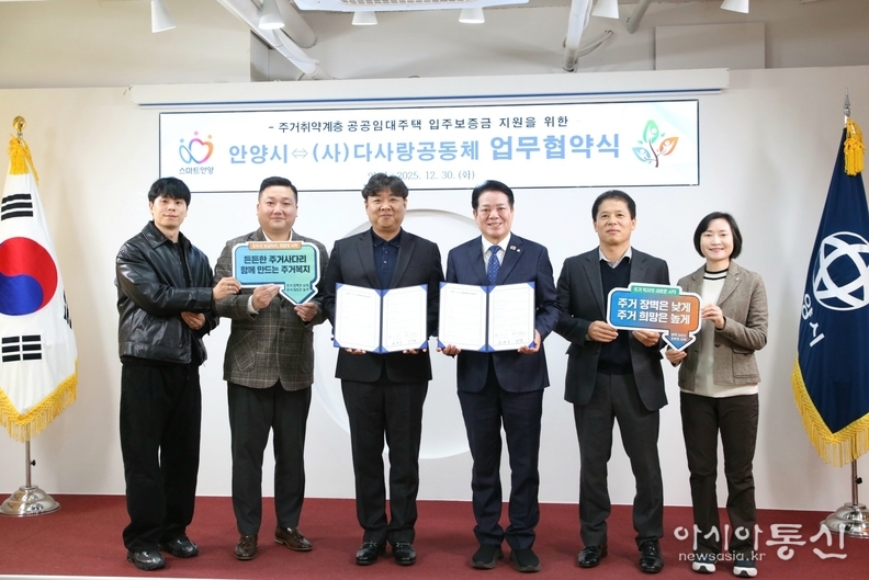 안양시(시장 최대호)는 30일 오전 10시 시청 3층 접견실에서 (사)다사랑공동체(회장 성재호)와 ‘주거취약계층 공공임대주택 입주보증금 지원을 위한 업무협약’을 체결했다.